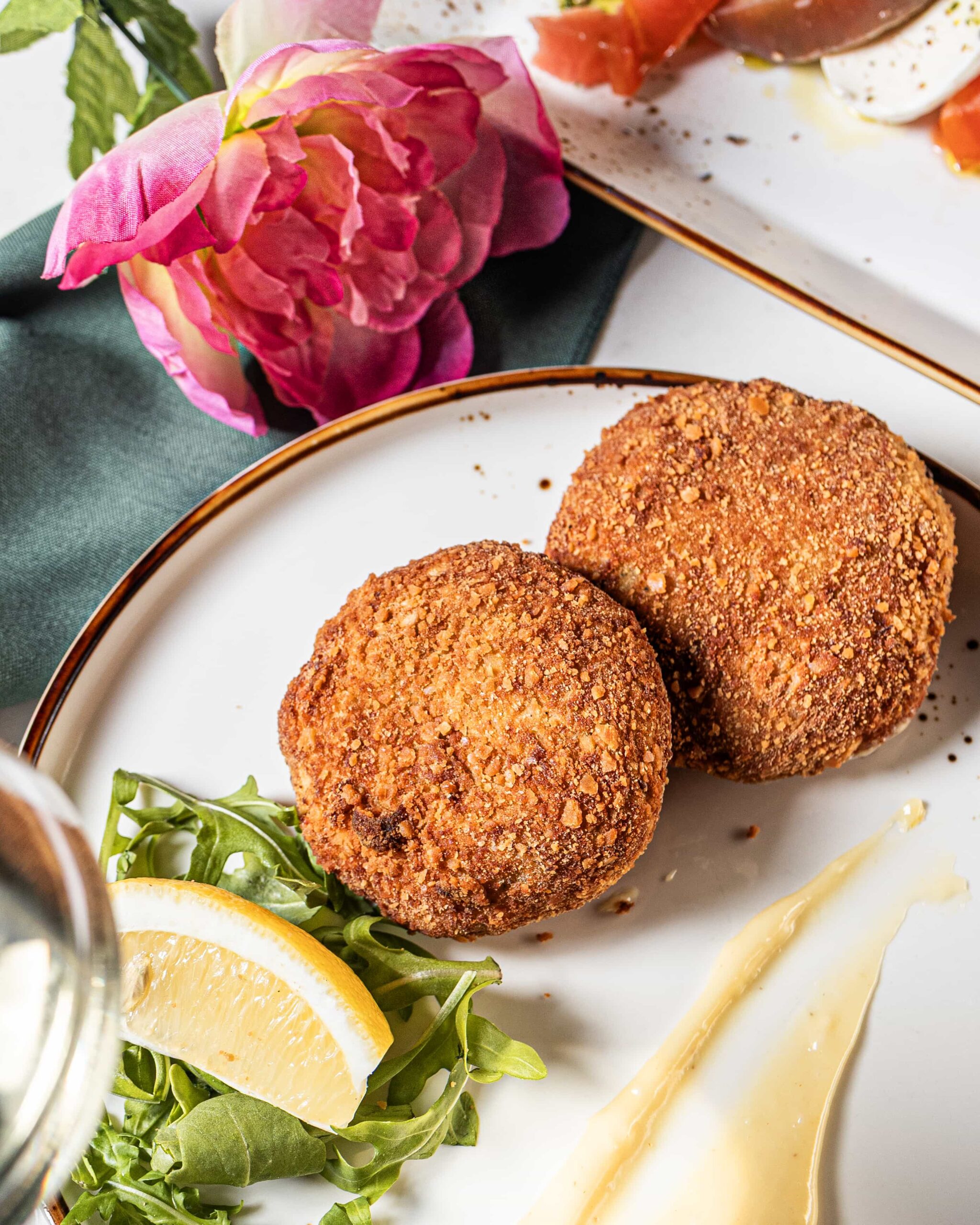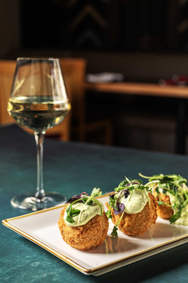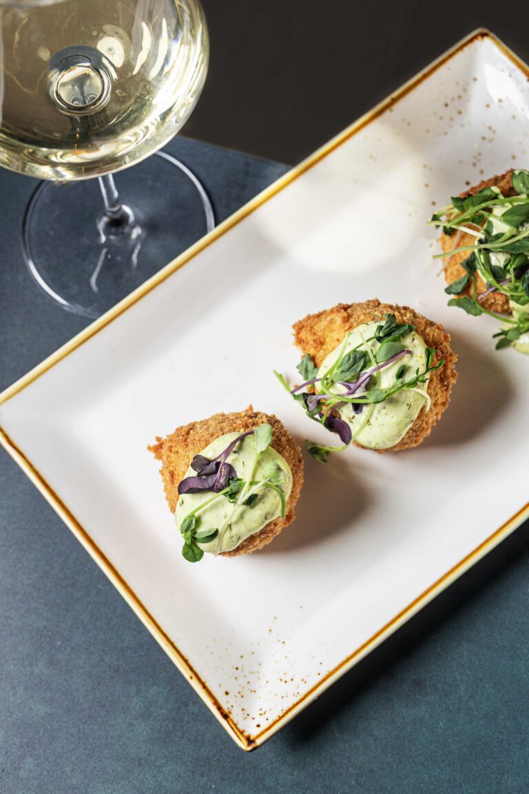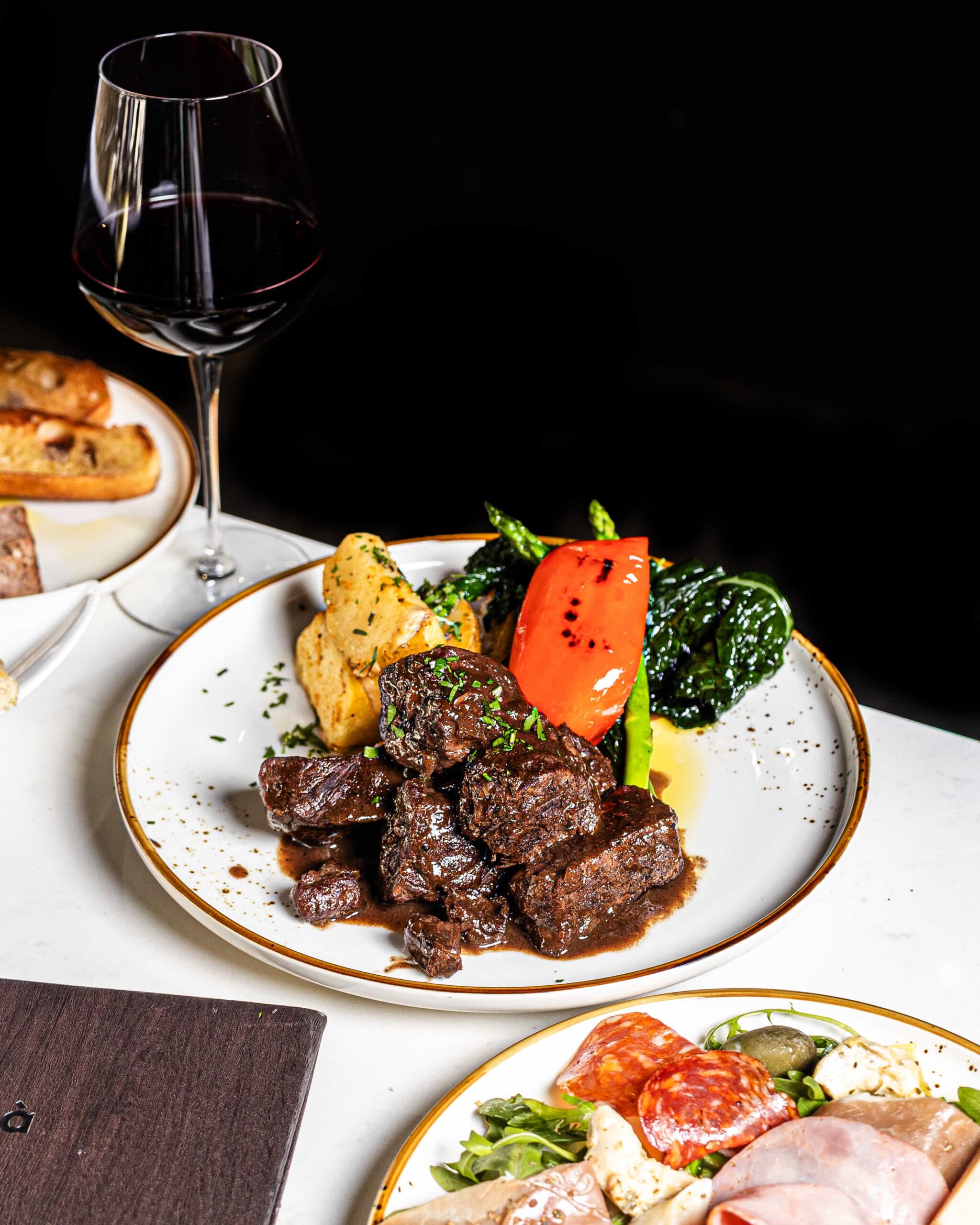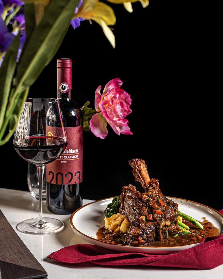 Slow-cooked lamb, spicy polenta, asparagus, red pepper, white wine sauce