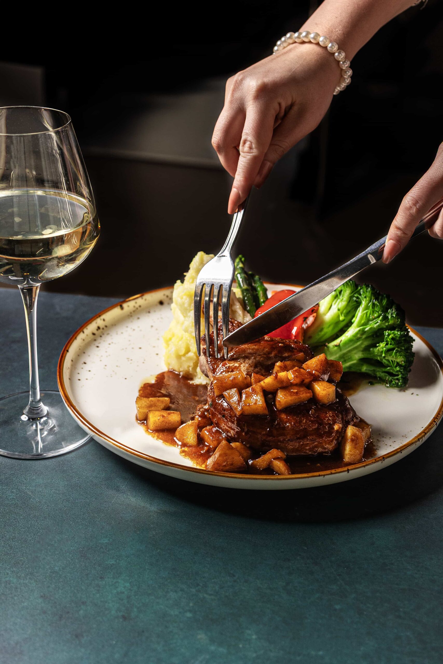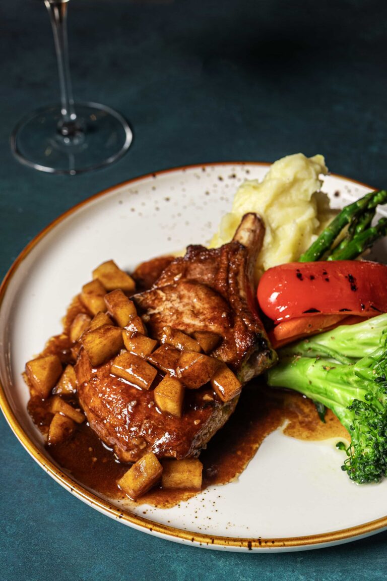 Apple walnut brandy sauce, mashed potato, seasonal vegetables