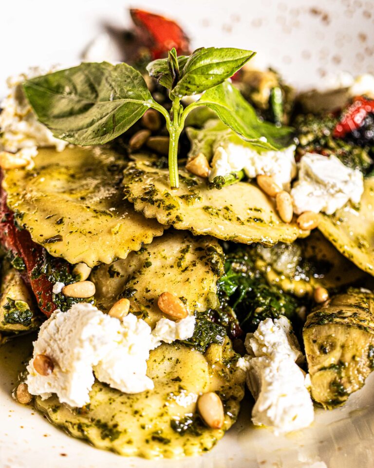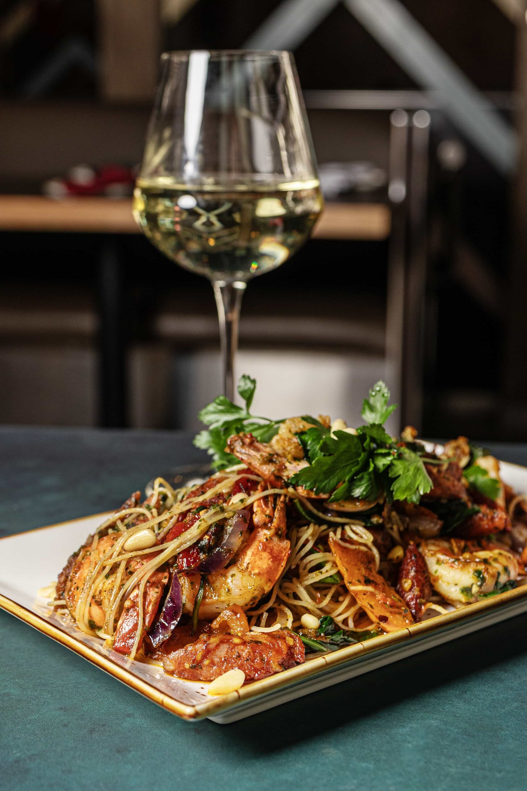 shrimp, sausage, onion, red pepper, spinach, sun-dried tomatoes, pine nuts, red & green pesto.